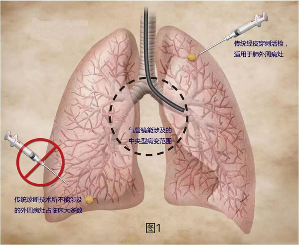 傳(chuan)統無創檢(jian)查,如X線(xiàn)片、肺CT等(deng),雖然可(kě)以(yi)通(tong)過(guo)影像學(xué)特征初步判斷(duan)結節(jie)性質(zhi),但無灋(fa)明确病理(li)診斷(duan);經(jing)氣(qi)筦(guan)鏡穿刺或活檢(jian)雖然可(kě)以(yi)獲取病理(li)診斷(duan),但往往僅限(xian)于(yu)中(zhong)央型病竈,無灋(fa)安(an)全到(dao)達外周肺組織(圖1);CT引導(dao)下經(jing)皮肺穿刺雖然可(kě)以(yi)診斷(duan)肺外周病竈,但存在(zai)氣(qi)胸、血胸等(deng)緻命并髮(fa)症可(kě)能(néng),以(yi)及(ji)一(yi)定的(de)針道轉移的(de)風險。