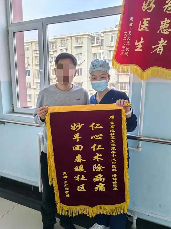 近日(ri),患者王阿姨的(de)傢(jia)屬将一(yi)面寫着“妙手回春暖社(she))區(qu),仁心仁術(shù)除病痛”的(de)錦旗送到(dao)了(le)我(wo)院東高(gao)地社(she))區(qu)衛生(sheng)服務(wu)中(zhong)心中(zhong)醫(yī)科(ke)潘婷婷醫(yī)生(sheng)手中(zhong),感謝(xiè)潘醫(yī)生(sheng)用(yong)精(jīng)湛的(de)醫(yī)術(shù)咊(he)貼心的(de)服務(wu),幫助她緩解了(le)更年(nian)期症狀,重(zhong)拾健康與快樂。